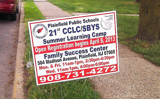 The sign is promoting the Plainfield Public Schools' summer learning camp and in English on one side, Spanish on the other.